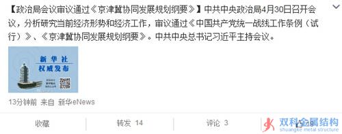 政治局會議審議通過《京津冀協(xié)同發(fā)展規(guī)劃綱要》